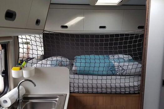 Travel Shortcut haben ein Heckbett quer in ihrem Wohnmobil, das sie mit einem hohen Netz absichern. Das Netz ist am Bettkasten angeschraubt und seitlich links und rechts an der Außenwand bzw. der Badezimmerwand eingehängt.